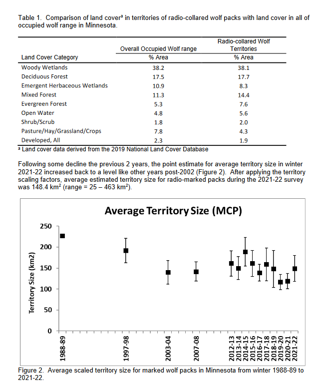 The methodology used to estimate wolf population size in Minnesota utilizes three primary pieces of information: 1) an estimate of the total area of land occupied by wolf packs; 2) an estimate of average wolf pack territory size; and 3) an estimate of average mid-winter pack size. It is likely that occupied range changes on a comparatively slow timescale compared to fluctuations in average territory and pack size. As such, occupied range is estimated at approximately 5 year intervals, with the last being during winter 2017-18; we assume that occupied range has remained unchanged (i.e., 73,972 km2; Erb et al. 2018) and use that in our population calculations for winter 2021-22.